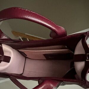 Stylish Marc Jacobs tote in rich burgundy. Features sturdy handles and bold branding.