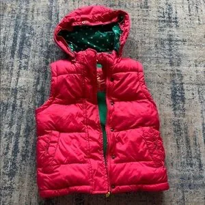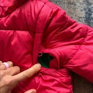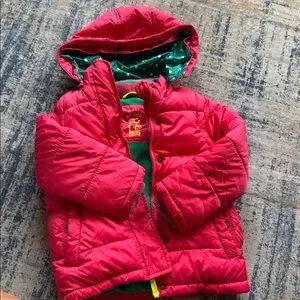 Vibrant red puffer jacket with playful green polka dot lining on hood and solid green fleece lining on bodice. Features a removable hood and removable sleeves to turn into a puffer vest. Vest can be worn with or without the hood, as well. The hood originally had a faux fur trim but we removed it and no longer have it.