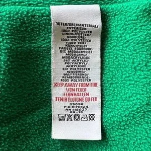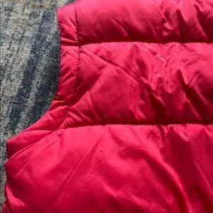 Two small imperfections: one discoloring at the base of the sleeve and minor pilling on the back left (see pictures). Otherwise in great condition! My daughter loved this jacket - warm and comfy!!