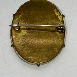 This antique brooch features delicate forget-me-nots hand-painted on an oval porcelain base, framed with gold-tone base. A charming vintage accessory piece.