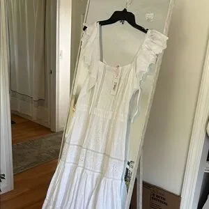 Elegant white maxi dress with delicate ruffle sleeves. Perfect for summer occasions.