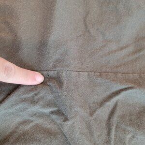 Tiny hole in back. Has front pockets. I would say runs small.