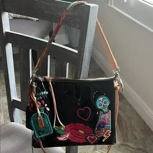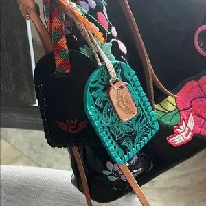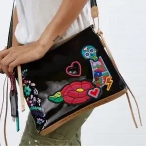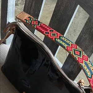 Gorgeous!!! Stylish and vibrant, Consuela Poppy downtown SHOULDER bag. This was originally a crossbody bag, but I felt the bag was too large for a crossbody, so I upgraded the strap to the $125 woven leather shoulder strap. I am also including the leather mantra key ring as an added bonus! See all pics. Patent has some marks from normal wear. Original crossbody strap not included. Measures approx 11” wide x 10” high x 3” deep with 8”strap drop.