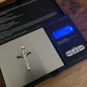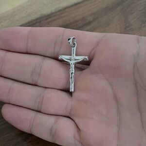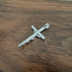 Excellent condition silver cross pendant. Not sure what material it is. Couldn’t find if it’s Sterling or not. Can fit up to 3mm chains
