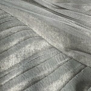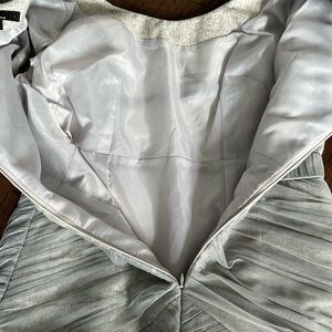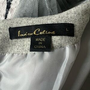 This unique 3/4 sleeve structured dress features a wool fabric with a tulle overlay and a hidden back zipper closure. Dress is fully lined so there is no scratchiness from the fabric.