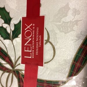 NWT Lenox Holiday Nouveau Rectangle Tablecloth. Measures 60 x140 and designed for table that seats 12-14. Original MSRP on this was $140.00. This timeless classic has an ivory damask background with a Holly berries, gold ribbon and a red and green plaid ribbon print. Fabric is 58% Cotton and 42% Polyester. Great for any holiday party or formal holiday dinner. No rips, stain, or flaws and comes from a NS home. See pics for more details. Reasonable offers always considered so please feel free to make me an offer if you don’t like the price.