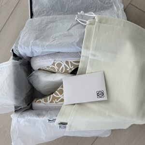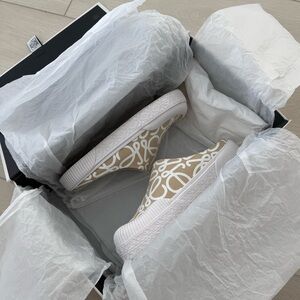 - Canvas slip-on sneakers with the Loewe logo designed in beige and white