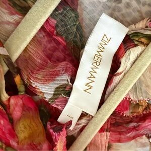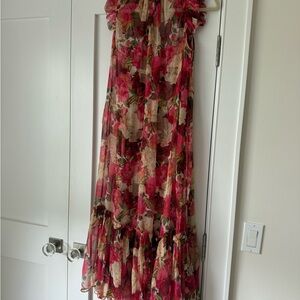 Chic dress with a multicolor floral design. Features vibrant hues. Printed slip included and adjustable straps. Belted at waist. Hits around ankles on 5’4”