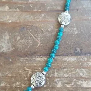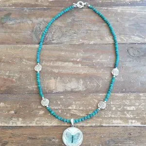 This stunning broken china necklace features malachite beads and butterfly details, perfect for enhancing any ensemble with a splash of color and sophistication. Handcrafted by The Emerald Spirit.