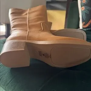 Stylish knee-high boots. Smooth tan finish. Chunky heel for comfort. Worn once