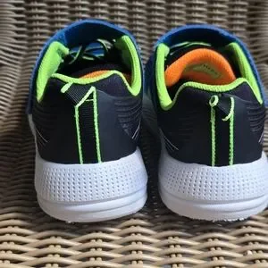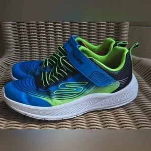 Bright Skechers sneakers with blue and neon green accents. Ideal for active kids. Comfortable and stylish.
