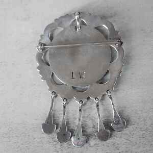 Lorraine collaborates with her husband, Luwayne Waatsa. Lorraine excels in stone cutting and shaping, and Luwayne specializes in the intricate silverwork that complements her stone placements. Their combined expertise results in highly collectible Zuni cluster jewelry, admired for its precision and the use of high-quality materials, such as the Mediterranean (ox-blood red) coral used in this beautiful pendant/brooch.