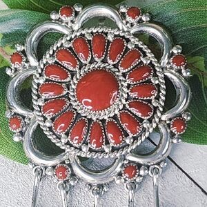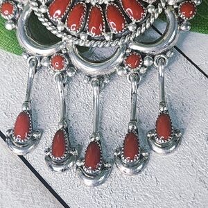 This exquisite piece showcases the intricate Zuni clusterwork style, characterized by numerous hand-cut and expertly arranged gemstones, in this case, vibrant red Mediterranean coral. The pendant/brooch also features delicate silverwork, including a central rope-like design and dangles with additional coral accents.