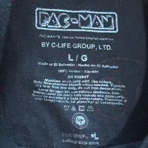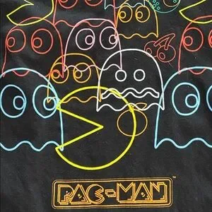 Black tee with neon Pac-Man graphics front + back. 100% cotton + soft feel. Unisex Large — works for men or women.