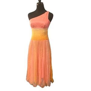 This pretty dress from Laundry by Shelli Segal could easily be a costume for Shakespeare's Tempest or a Midsummer Night's Dream. Beautiful silk dress has skirt composed of strips of multicolor silk with tiny pink accent beads. Colors layered over colors, a ruched waist panel and simple, flawless one shouldered bodice complete the look. Dress is new with tags, size 2 by Shelli Segall. Retail: $340. A fairyland dream dress.