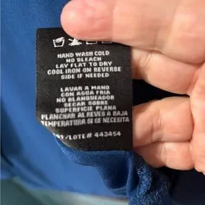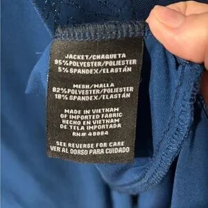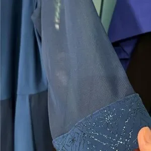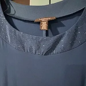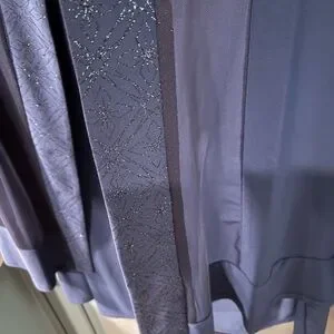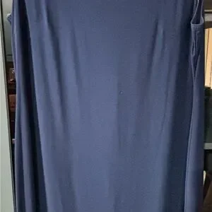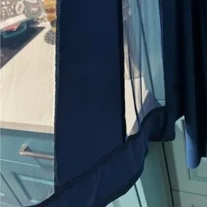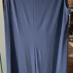 Beautiful dark blue 2 piece sheath dress with over tunic. This is a size 14W. The over tunic has a gorgeous sparkly trim along the neck and down the front. It has elbow length sleeve with the same trim at the bottom. The sleeves are sheer and the bottom half of the over tunic has several sheer panels interspersed with the solid material. The sheath dress is sleeveless, with sparkly trim at the neckline. The dress is about 4” longer than the over tunic. Knee length.