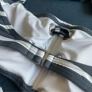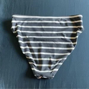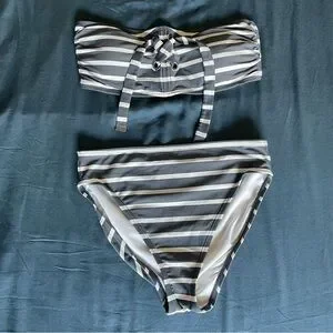 Micheal Kors large gray and white striped bikini set. Silver details, padded bra. Bottoms are high waist, mid coverage.
