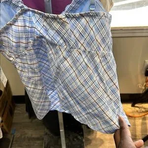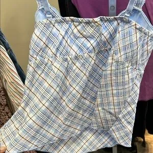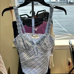 Chic light blue plaid camisole featuring lace straps. Ideal for everyday style.