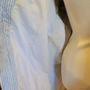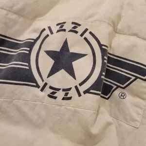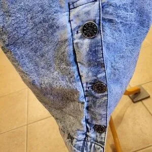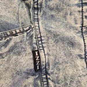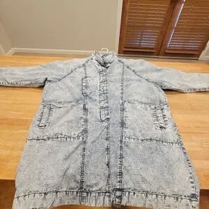 IZZI BRAND. VINTAGE & Stylish acid wash denim coat. This BEAUTIFUL coat has button-down closure, two oversized exterior pockets, plus two smaller pockets. On the back of this GORGEOUS COAT at the bottom has three buttons. Collar has drawstring closure. Cuffs can be rolled up to display a striped pattern. Fabric is 100% cotton with a STUNNING ACID WASH FINISH. Interior features Izzi's signature logo. This is an oversized coat.