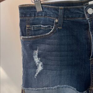 Chic jean shorts with distressed accents. Frayed hem adds a trendy touch. Ideal for casual outings.