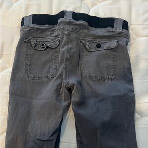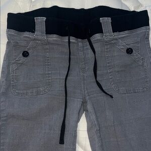 Stylish gray pants featuring a black waistband. Perfect for casual wear.