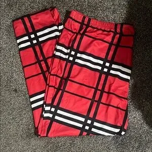 Stylish red plaid woman leggings featuring a bold design. Perfect for casual outings or making a statement. Comfortable fit with an elastic waistband.