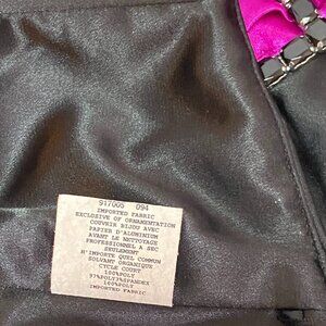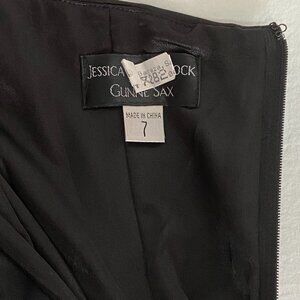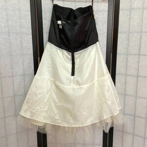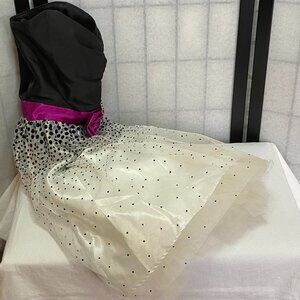 Vintage Strapless Short Prom Formal Dress from Jessica McClintock for Gunne Sax. Lovingly worn, not torn or stained – looks in excellent condition. Dry Cleaning tag still attached. Fit and flare silhouette. Black satin bodice, bright magenta waistband accented with large, jeweled bow. Shirred center front forms sweetheart neckline. White skirt with black dotted netting overlay. Dots become smaller and sparser towards hem. There are some dots with sparkles for even more splash. Skirt is fully lined. Another layer has built in petticoat with a ruffled net double flounce at hem for added twirl. Back zip with hook and eye closure. Estimate to be from 1980's maybe 90's, definitely after the 70's prairie style Gunne Sax era. Perfect for prom, homecoming, weddings, garden parties, or any formal event, this dress delivers timeless style with a magical, vintage flair.