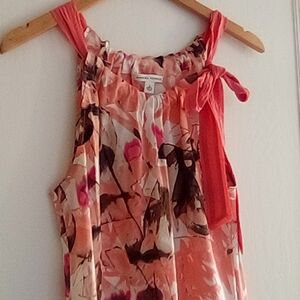 Stylish sleeveless blouse with coral straps. The strap ties asymmetrically very chic.  Features a vibrant floral pattern. 100% silk from Banana Republic.  Perfect for casual or dressy occasions.