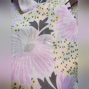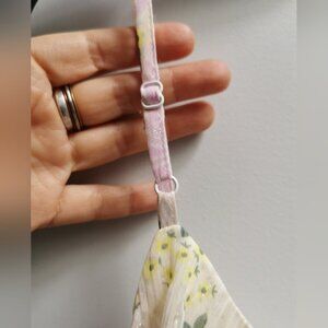 Vneck sleeveless ruffle trim on front adjtable spaghetti straps allover floral print