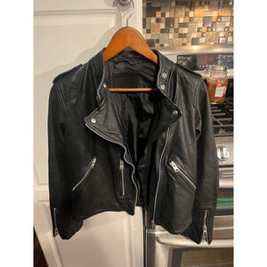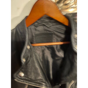 Design: Asymmetrical zip closure, notched collar, zip cuffs, shoulder epaulets, and zip pockets.