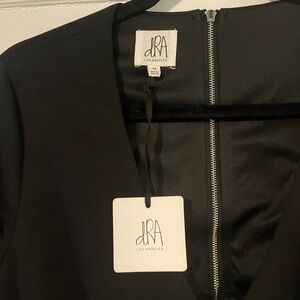 Black cocktail dress with long sleeves, deep V-neckline, lower back cutout, silver tone zip closures, and front split.