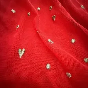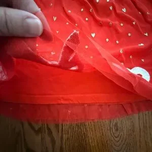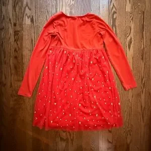 Play condition long sleeve red dress. Top is knit. Skirt is double layer tulle skirt with embroidered gold hearts and white bows. Perfect Christmas dress.