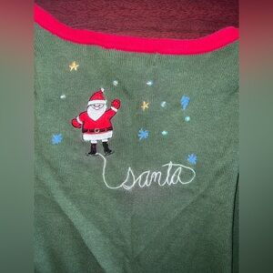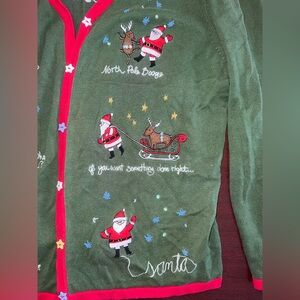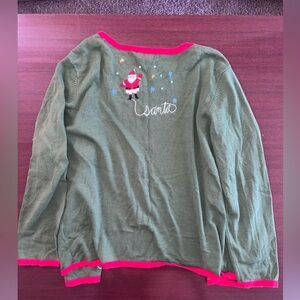 Festive Christmas sweater by Christopher & Banks in a women’s XL. Charming green cardigan with embroidered Santa Claus and holiday motifs including sleighs, reindeer, and snowflakes. Features bright red trim for a cheerful holiday look. Perfect for Christmas parties, family gatherings, or an ugly sweater contest with a cute twist.