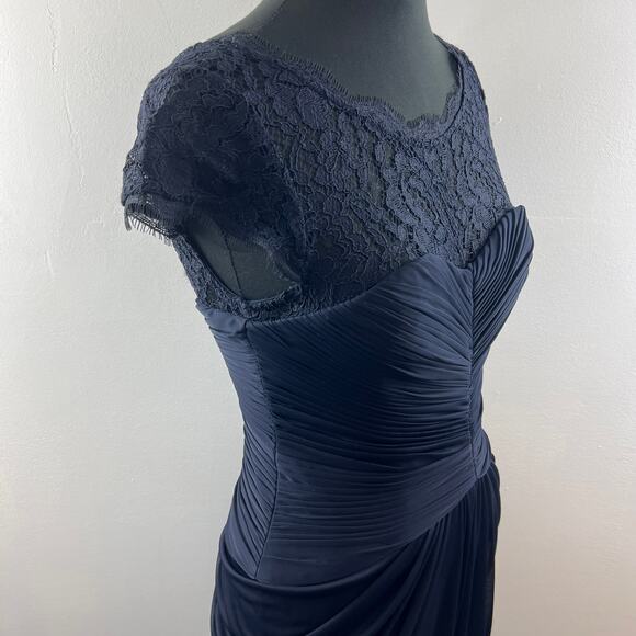 Adrianna Papell Short Sleeve Evening Gown Navy Lace Yoke Gathered Pleats Size 6