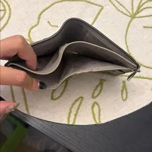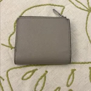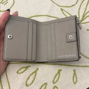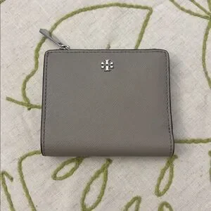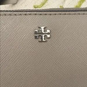 Elegant taupe wallet by Tory Burch. Features a silver logo and zip closure.