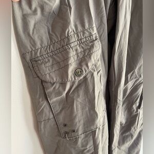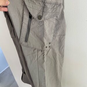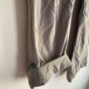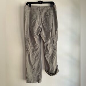 Durable REI hiking cargo in a tan (maybe kind of olive? A little grayish?) color. Lots of pockets! Pants roll up and secure to capri length. Ideal for outdoor adventures.