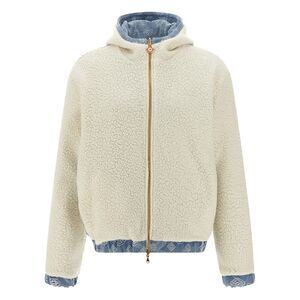 Reversible jacket in monogram cotton denim and teddy-effect fabric, hood, front zip closure, pockets, long sleeves with elastic cuffs, elastic hem.