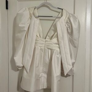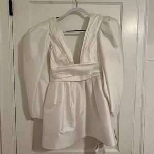Chic mini dress with voluminous puff sleeves. Deep V-neckline adds elegance. Perfect for bridal parties or reception dress. Never worn.