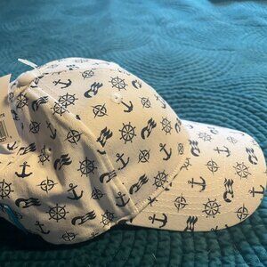 Official Princess Cruises souvenir cap. Features an allover navy nautical icon print (anchors, ship wheels, waves, compass stars) on a crisp white cotton base. Adjustable strap for one-size-fits-all comfort.