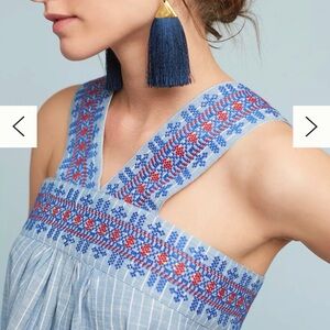 Kopal top with blue stripes and floral accents. Lightweight and stylish. Pet and smoke free home. Good condition. Worn a handful of times. Size L.
