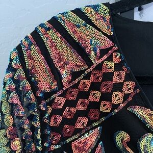 AKIRA, long sleeve, bodysuit, sequins, mesh, sparkle, party, festival, night out, club, holiday, rave, concert, statement piece, colorful, feminine, fun