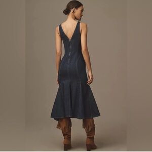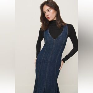 Reformation Serafina Denim Midi Dress in Ithica. Women’s Size 10. At once causal and sexy, this responsibly made Serafina dress by Reformation is versatile. Layer on cooler days, or wear alone. Godet pleats enhance the fluttery movement of an effortlessly chic midi dress cut from soft cotton denim in a sweeping A-line silhouette. 100% non-regeneratively grown cotton, back zipper, and mermaid skirt. New with tags