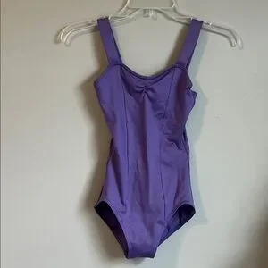 Elegant purple leotard by Capezio. Features wide straps and a scoop neckline. Perfect for dance or gymnastics.