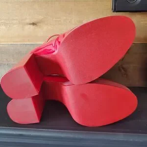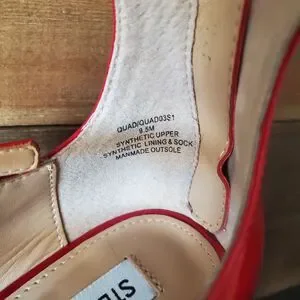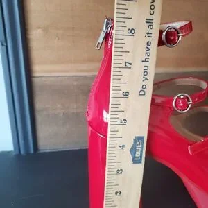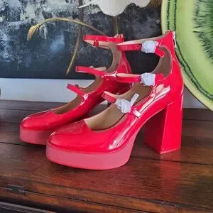 These Steve Madden Mary Jane chunky high heels feature a round toe, three buckles for closure, and a high block heel. They are red pumps with zipper accents, suitable for parties, casual, formal, or business occasions. The shoes are a size 9.5M, with an ankle strap and adjustable buckle. Made of faux leather with a polyester upper, they are stylish for fall and spring wear.