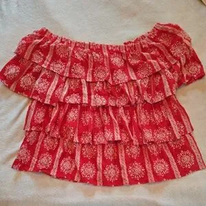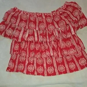 This charming blouse features a vibrant red and white color palette with delicate ruffles cascading in tiers for a voluminous look. The off-the-shoulder design is held securely with an elastic band, making it a perfect choice for warm, sunny days. This baddy is a necessity in EVERY woman's wardrobe!!