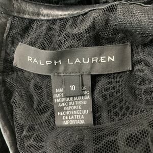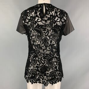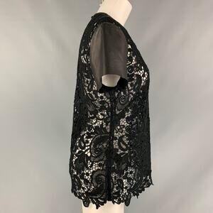 RALPH LAUREN Size 10 Black Guipure Cotton Leather Trim Short Sleeve Dress Top