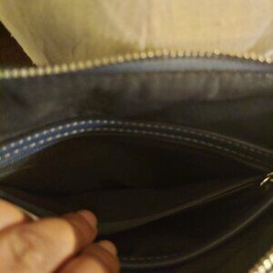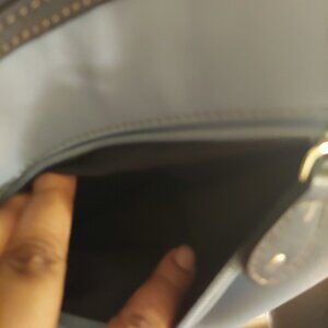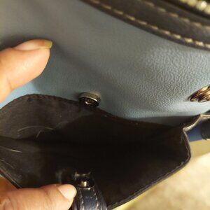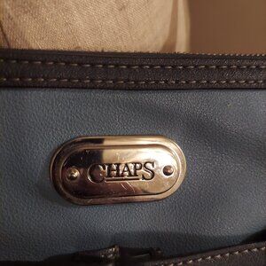 This CHAPS 4 pocket crossbows bag is perfect for everyday use. This medium sized purse is made with durable materials and features 2 zippers, 2 smaller pockets with magnetic closures on the outside. It also has a back compartment. There is a silver plaque with the brand logo in black letters on the front of the bag. This bag is a baby blue in color with navy blue outlining and a navy interior. THIS BAG IS PRELOVED but has no visible stans or flows.