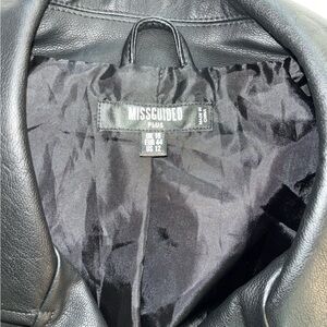 Chic black biker jacket. Features silver hardware. Perfect for edgy style. **missing belt**