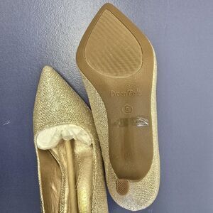 This product is a pair of NWB Women's Cole Haan Size 5 Mylah Dream Pairs Pumps in Nude/Sequence. These slip-on pumps feature a pointed toe and a mid heel with a kitten style. Made of leather, they are lightweight and comfortable for going out. The nude and sequin color adds a stylish touch to these elegant heels. Perfect for any special occasion or a night out, these Cole Haan pumps are a versatile addition to any woman's shoe collection.