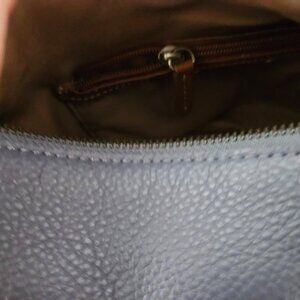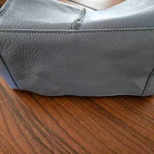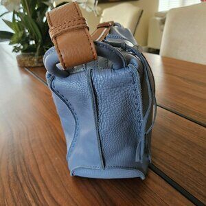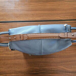 Chic blue hobo bag with front zipper pocket. Brown strap for stylish contrast. The SAK Feliz